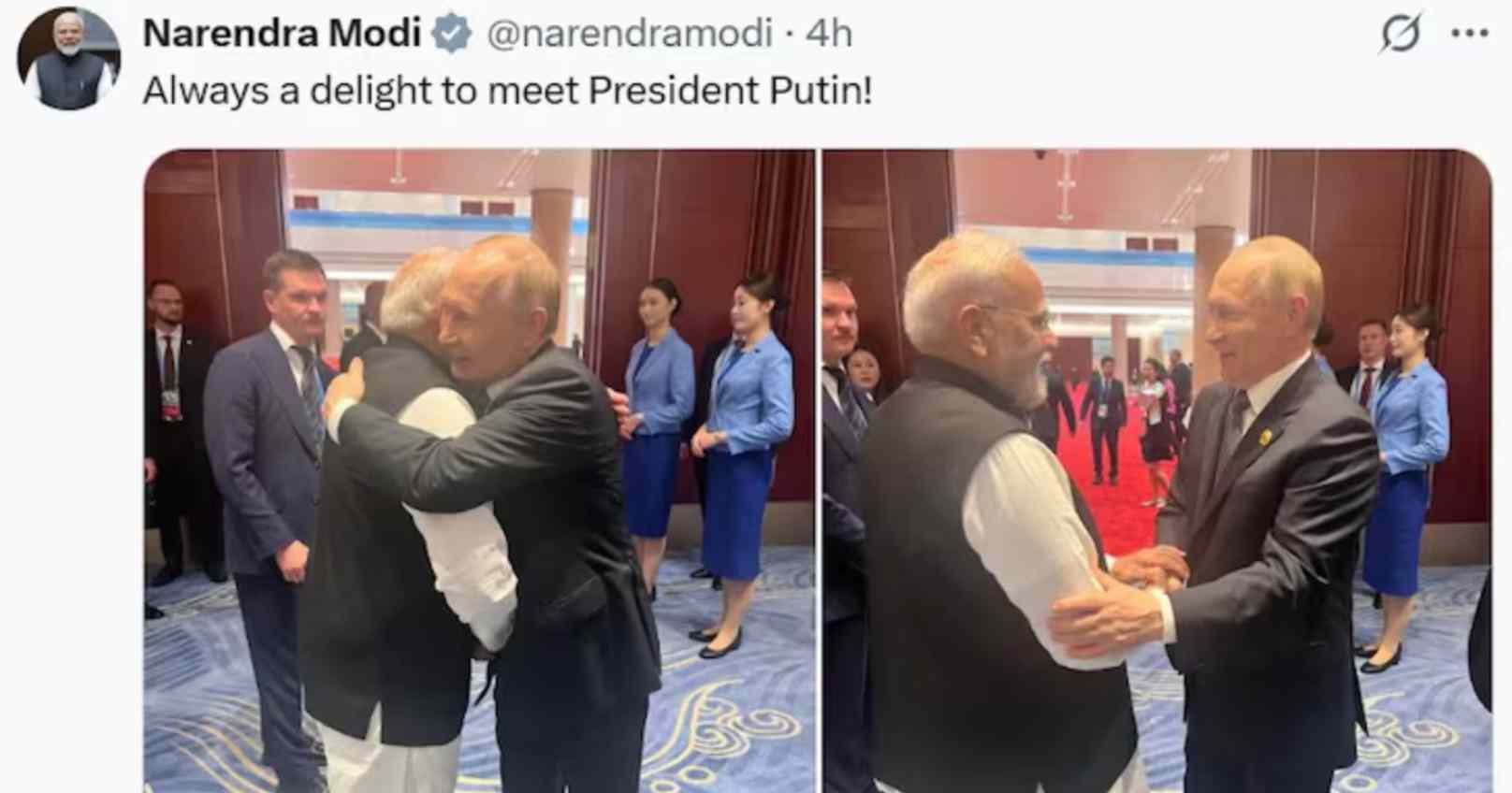 The joint ride came after the leaders exchanged a warm hug at the summit venue, a moment that quickly went viral online. Modi later posted about the meeting, saying: “Always a delight to meet President Putin!”